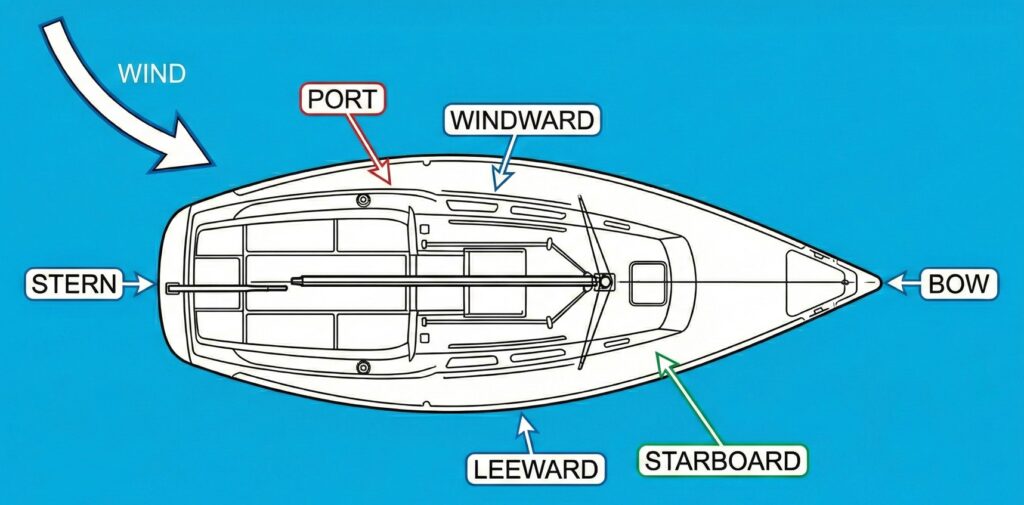 Directional sailing terms help you communicate clearly about where things are located or where the wind is coming from. They replace everyday words like left and right.